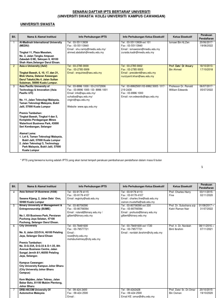 Pdf Senarai Daftar Ipts Bertaraf Universiti Universiti Swasta Kolej Universiti Kampus Cawangan Universiti Swasta Euro Tour Academia Edu
